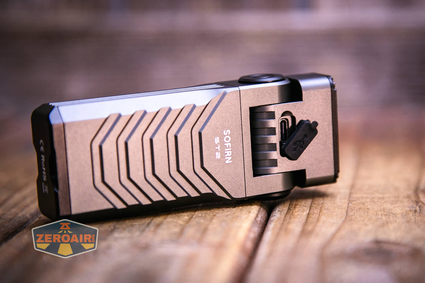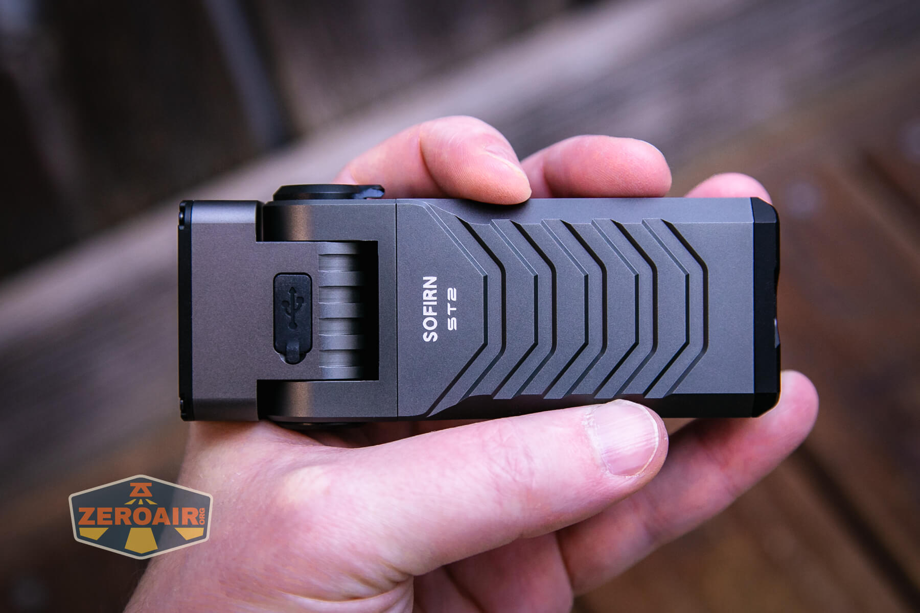 The Sofirn ST2 multi-function flat flashlight expenses through USB-C. The cost port has a press-in cowl.
